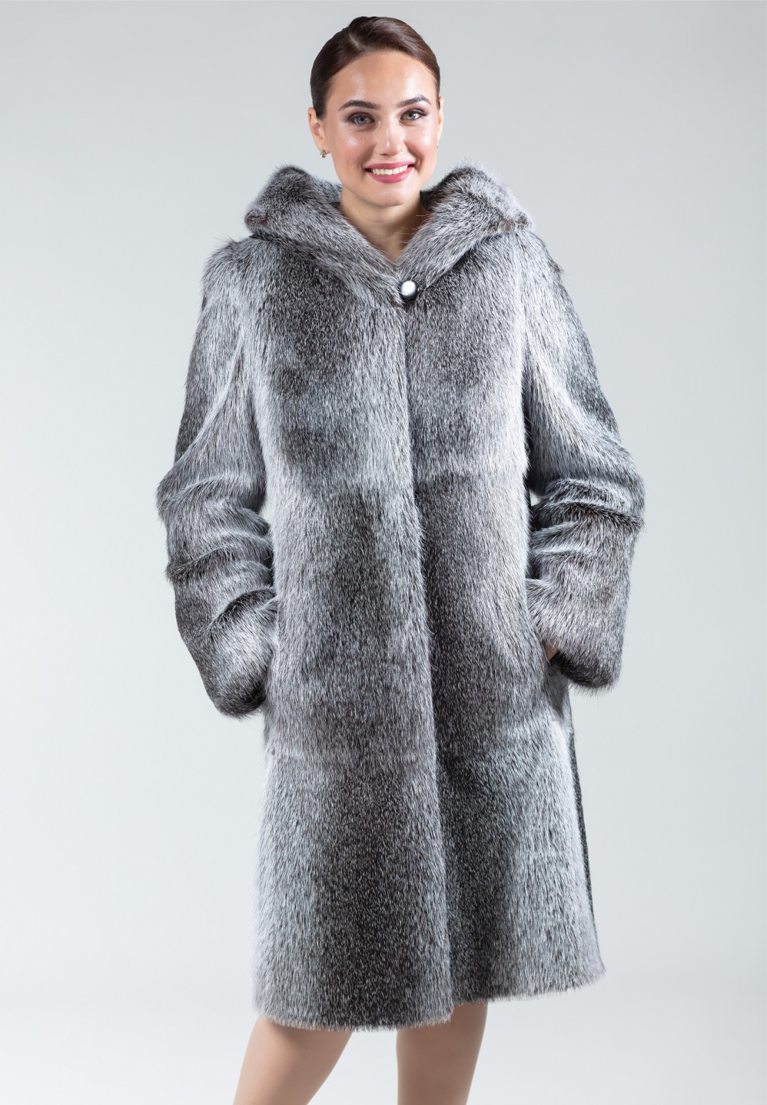 Шуба из нутрии «Ева» капюшон серебро цвета серебро