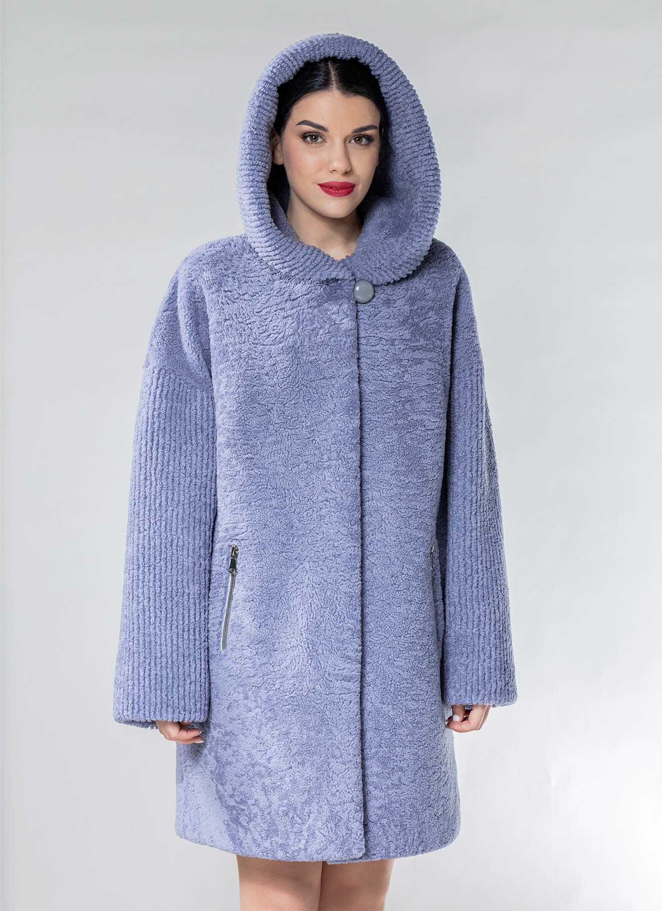 Полупальто с капюшоном из овчины с эффектом керли, классическая модель в современном звучании. А-образный силуэт полупальто, плоский завиток керли, крой цельными пластинами — все это элементы классики зимнего гардероба. Пикантные нотки придает изделию выраженный ребристый рисунок, полученный путем особой обработки овчины. Фактурные ребристые вставки отчетливо выделяются в отделке капюшона и рукавов. Еще один необычный акцент — застежки-молнии рядом с прорезными карманами. Вы можете не заботиться ни о головном уборе, ни о дополнительных украшениях — шуба «Эльза» объединила в себе все, что нужно в промозглое межсезонье или европейской зимой.Характеристики